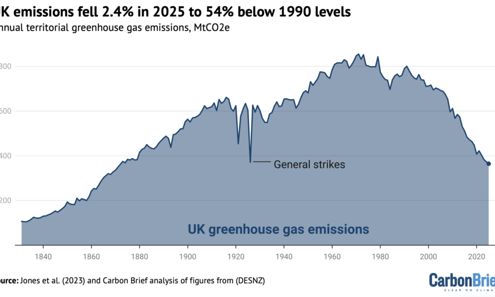 The UK’s greenhouse gas emissions fell by 2.4% in 2025 to their lowest level in more than 150 years, according to new Carbon Brief analysis. The...