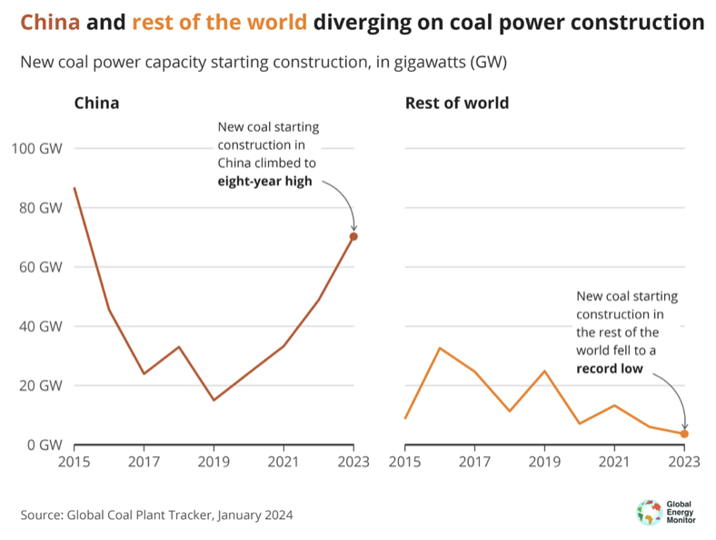 根据全球能源监测组织(GEM)的最新年度报告,2023年中国煤电建设活动占全球新建煤电活动的95%。 GEM的全球煤电行业年度报告称,中国有70吉瓦(GW)的煤电装机容量破土动工,相较2019年增长了四倍。 相比之下,世界其他地区新开工煤电装机容量不足4吉瓦,是2014年以来的最低水平。 除中国外,只有32个国家有处于拟建阶段的新建煤电项目,只有七个国家有在建电厂。 虽然2023年全球煤电装机容量(包括总装机容量和中国以外地区的装机容量)有所增长,但GEM表示,这很可能只是“昙花一现”,随着未来几年美国和欧洲加速煤炭退役,这一增长将会被抵消。 该报告的其他主要发现包括:全球燃煤电厂——中国以外地区——建设连续第二年下降。然而,全球煤电厂的退役率也处于2011年以来的最低水平。 中国的“关键时刻” GEM表示,2023年中国有47.4吉瓦的煤电装机容量投产。这一增量占全球在运煤电装机容量增长的三分之二,全球装机容量整体增长了2%,达到2130吉瓦。 2023年,中国有70.2吉瓦的新建项目开工,是世界其他国家,合计3.7吉瓦,的19倍。如下图所示,中国的发展轨迹(红线)与世界其他地区(橙色线)存在显著差异。 中国的新开工装机容量几乎是2019年的四倍,彼时中国的新建燃煤电厂开工量创下了九年来的新低。 这是中国每年开工建设的新燃煤电厂装机容量连续第四年增长。GEM指出,这与中国在2021年提出的“严控”新增煤电产能的承诺不符。 2022年初,中国国家能源局的《“十四五”现代能源体系规划》指出,到2025年将淘汰30吉瓦的煤电产能。 然而,GEM指出,如果算上发电装机容量至少达到30兆瓦(megawatts)的大型煤电机组,过去三年中关停的电厂不到9吉瓦,而且几乎没有其他电厂有退役计划。 GEM补充说,如果中国要实现30吉瓦的退役目标,“就必须立即采取行动”。 能源与清洁空气研究中心(CREA)中国分析师秦琦在一份声明中说:“最近中国煤电开发的激增与全球趋势形成了鲜明对比,使中国2025年的气候目标面临风险。在此关键时刻,中国必须对煤电项目实施更严格的控制,并加快向可再生能源转型,以重新履行其气候承诺。” 上微信关注《碳简报》 根据GEM的报告,中国、印度、孟加拉国、津巴布韦、印度尼西亚、哈萨克斯坦、老挝、土耳其、俄罗斯、巴基斯坦和越南共占全球拟建容量的95%。 该组织发现,剩下的5%分布在21个国家。报告补充称,其中11个国家仅有一个拟建项目,有望实现“无新煤电”这一退煤里程碑。 GEM追踪器显示,2023年,位于中国之外、全新规划的煤电项目装机容量达到20.9吉瓦。其中,印度新规划煤电装机容量达到11.4吉瓦,超过了2016年以来的任何一年。GEM解释说,这在一定程度上是由于该国几个停滞项目的重新启用。 哈萨克斯坦也有4.6吉瓦的新规划项目,印度尼西亚则有2.5吉瓦。另外还有4.1吉瓦之前被暂停或取消、但在去年被重新“规划”的项目。 另有几个国家——俄罗斯、菲律宾、博茨瓦纳和尼日利亚——也在2023年有项目重新规划和开工。 退役速度缓慢 GEM发现,2023年全球共有69.5吉瓦的煤电投产,同时有21.1吉瓦的煤电退役。这使得全球煤电在运装机容量的净增长达到自2016年以来的最高水平,猛增了48.4吉瓦。 此外,印度尼西亚(5.9吉瓦)、印度(5.5吉瓦)、越南(2.6吉瓦)、日本(2.5吉瓦)、孟加拉国(1.9吉瓦)、巴基斯坦(1.7吉瓦)、韩国(1吉瓦)、希腊(0.7吉瓦)和津巴布韦(0.3吉瓦)也有新增装机容量投产。 该组织发现,在2023年间,中国境外总共有22.1吉瓦装机容量投产,17.4吉瓦退役。这使得在中国以外运营的全球煤电机组净增加了4.7吉瓦。2023年,全球煤电装机容量达到2130吉瓦,比上年增长2%。 GEM表示,美国贡献了近一半的退役煤电机组装机容量,2023年有9.7吉瓦被关闭。不过,与2022年的14.7吉瓦和2015年的21.7吉瓦的峰值相比,退役量有所下降。...