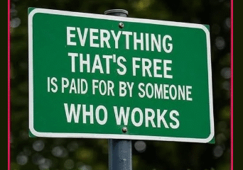 The message at left is true. Everything that is free in this country: roads, bridges, tunnels, firefighting, national defense, embassies, air traffic control, food safety, libraries,...