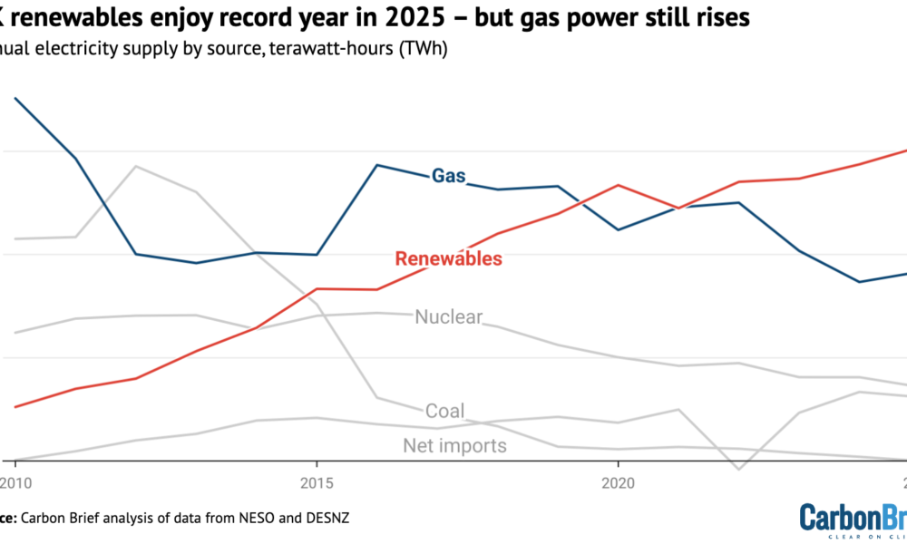The UK’s fleet of wind, solar and biomass power plants all set new records in 2025, Carbon Brief analysis shows, but electricity generation from gas still...