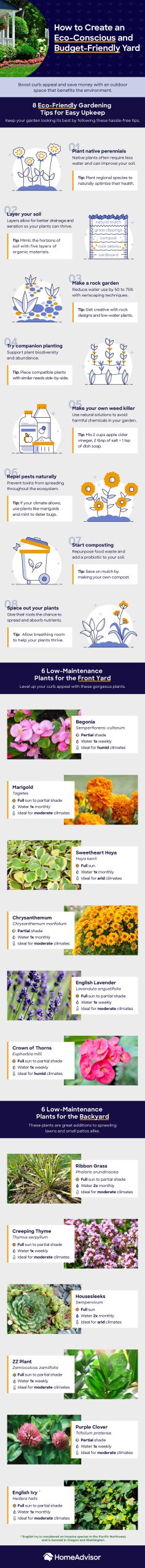 With careful plant selection and eco-friendly gardening strategies, you’ll enjoy a low-maintenance yard, save money, and benefit Mother Earth too! Check out the tips and plant recommendations in the following infographic from HomeAdvisor.