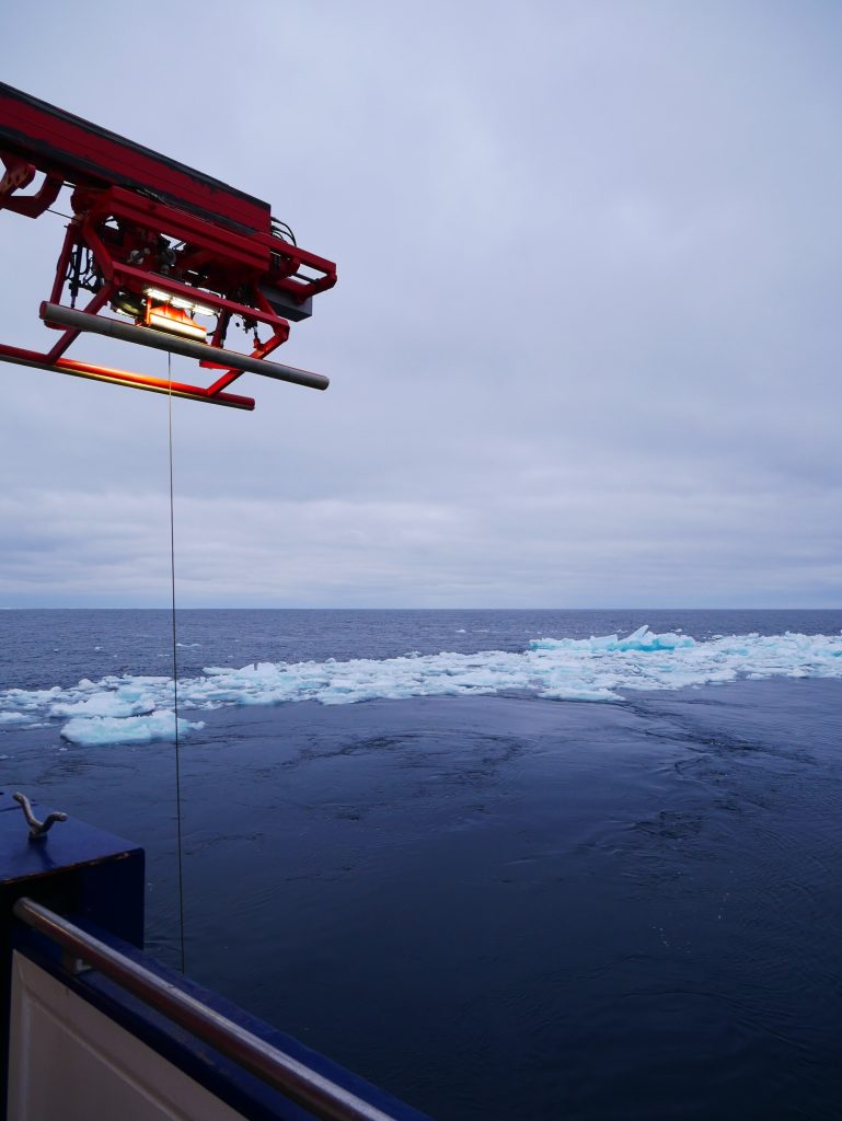 Das Ausbringen von K7 erwies sich als besonders schwierig. Beim ersten Versuch trieb das Meereis schneller auf uns zu als erwartet, sodass wir fast die Hälfte der Verankerung wieder einholen mussten. Obwohl das Schiff selbst gut durch treibendes Eis navigieren kann, ist das Ausbringen einer Verankerung deutlich anspruchsvoller: Dabei wird ein langer Draht mit Messinstrumenten und Auftriebskörpern hinter dem Schiff ausgesetzt, bevor am Ende der Anker gelöst wird und das gesamte System absinkt.