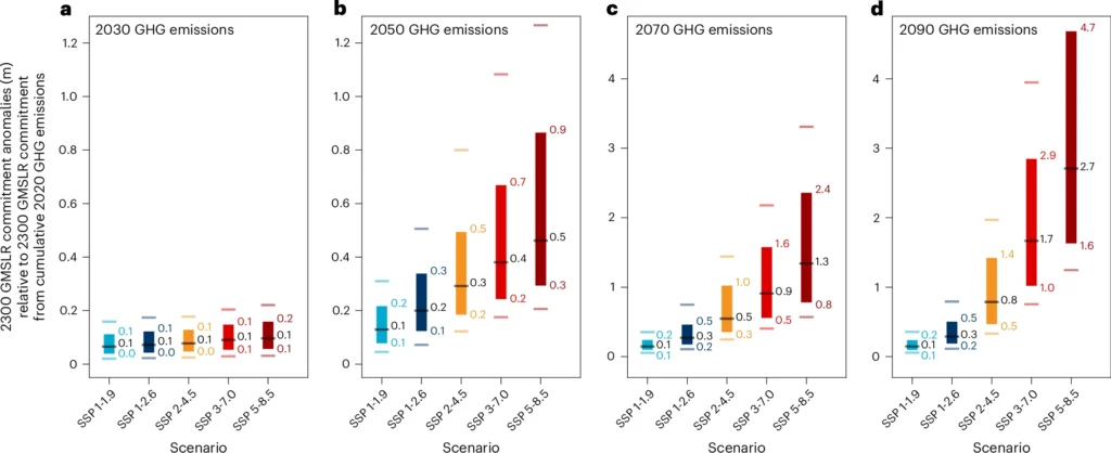 The authors find that, under the SSP2-4.5 “current climate policies” scenario, human-produced greenhouse gas emissions over 2020-50 will lock in an additional 29cm of sea level rise by the year 2300. This number grows to 79cm when including emissions out to 2090 under this scenario.