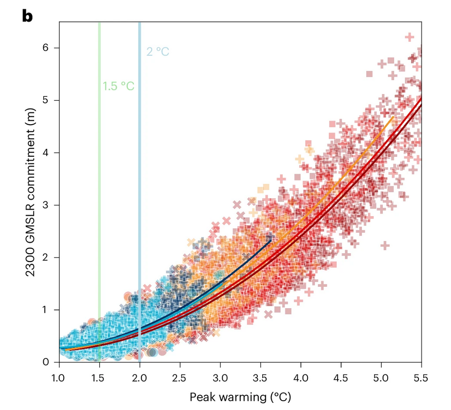 Committed sea level rise by 2300 at different warming levels, under SSP1-1.9 (light blue), SSP1-2.6 (dark blue), SSP2-4.5 (yellow), SSP3-7.0 (red) and SSP5-8.5 (dark red) pathways. Circles, X’s, squares and crosses indicate data points for 2030, 2050, 2070 and 2090 respectively. The green and blue lines show the 1.5C and 2C temperature thresholds. Source: Nauels et al (2025).